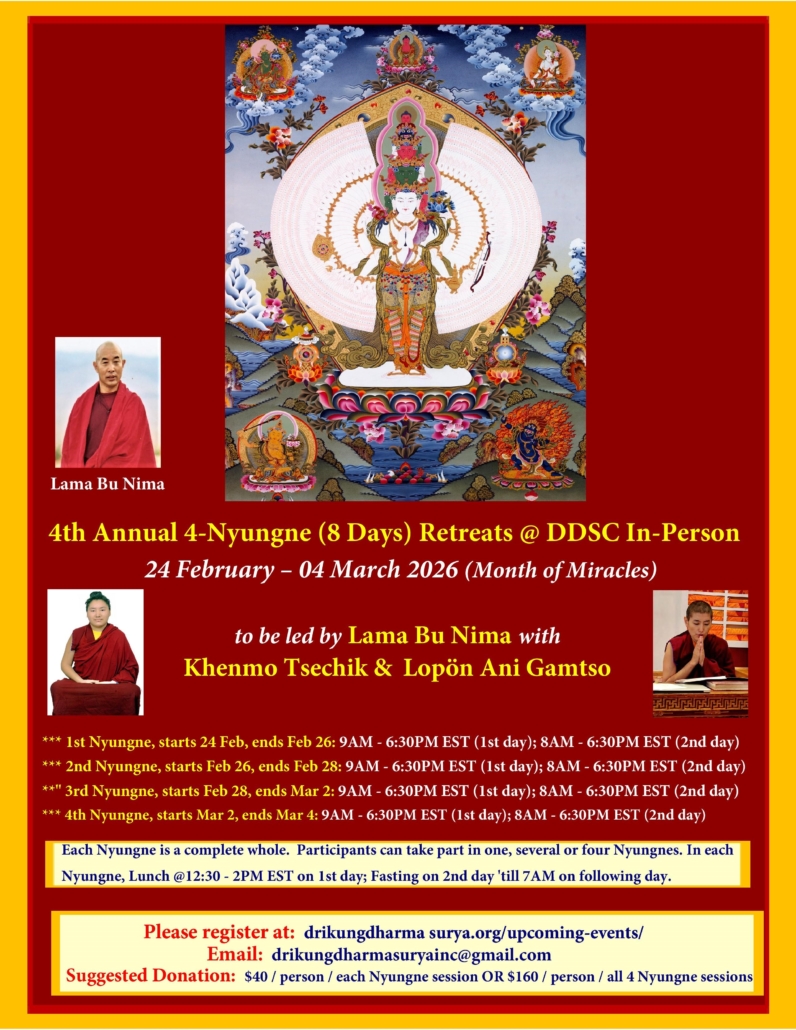Each Nyungne session is a complete whole. Participants can take part in one, several or four Nyungne sessions. In each Nyungne session, Lunch @12:30 – 2PM EST on 1st day; Fasting on 2nd day ’till 8AM on following day.