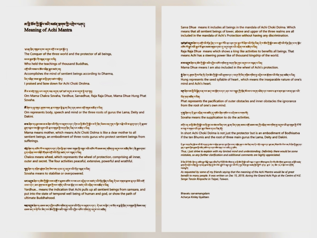 * Achi Chökyi Drolma is invoked to remove outer and inner obstacles, to protect from harm, and to create positive conditions for spiritual and worldly success.